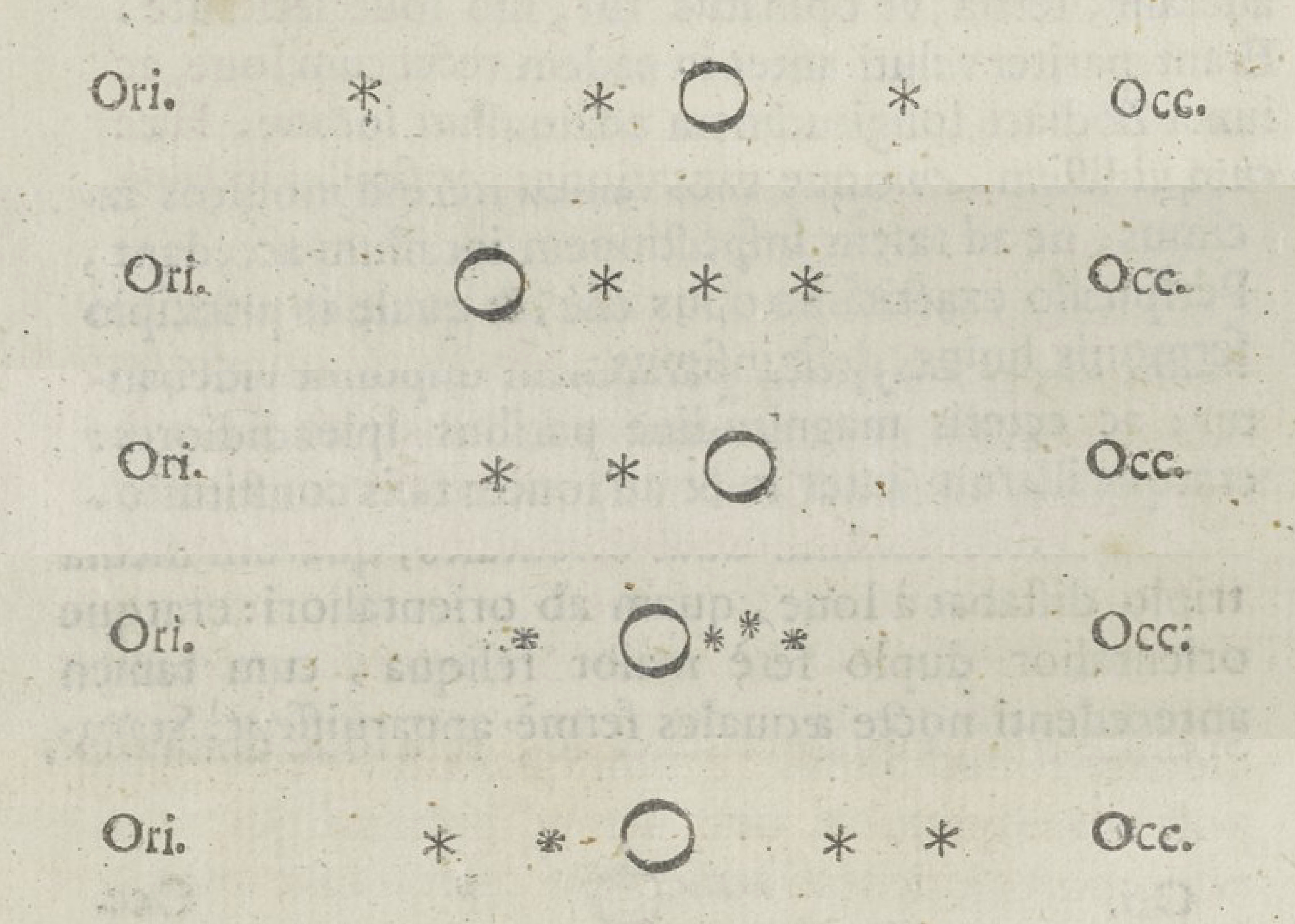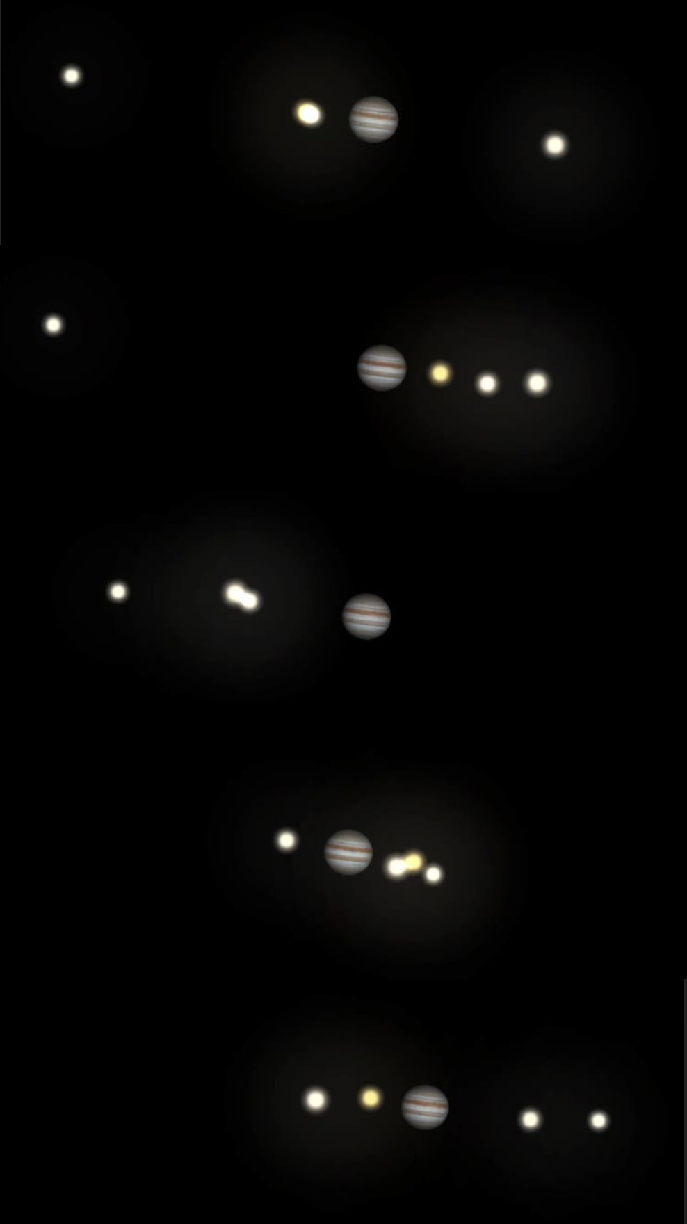 7 Jan8 Jan10 Jan13 Jan19 JanSidereus Nuncius1610SellariumJ'en ai conclu [...], qu'il y a trois étoiles dans les cieux qui se déplacent autour de Jupiter, comme Vénus et Mercure autour du Soleil [...]. [D]es observations [ultérieures] ont également établi qu'il n'y a pas seulement trois, mais quatre corps sidéraux erratiques effectuant leurs révolutions autour de Jupiter... les révolutions sont si rapides qu'un observateur peut généralement obtenir des différences de position toutes les heures.